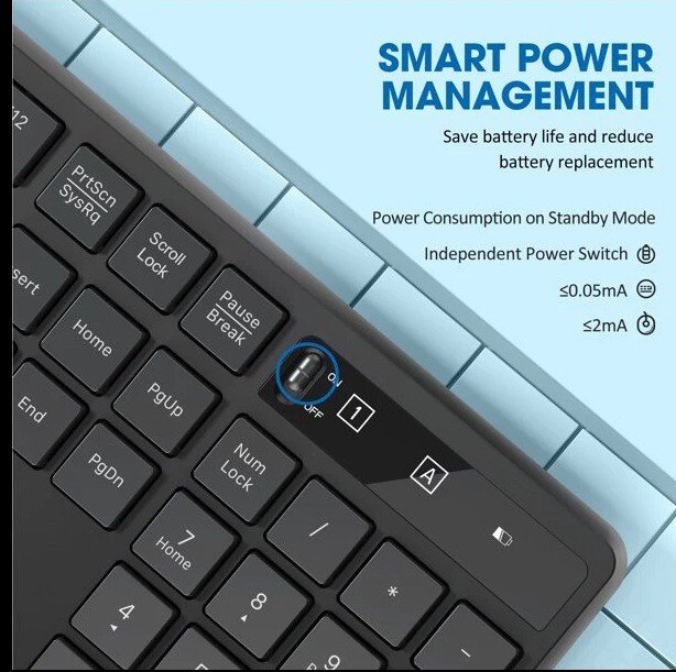 Gestion intelligente de l’alimentation : le clavier ergonomique sans fil est alimenté par une pile AAA (piles non incluses). Le clavier est doté d’un interrupteur marche/arrêt facile à voir : assurez-vous de l’éteindre lorsqu’il n’est pas utilisé, ce qui pourrait économiser la batterie et réduire son remplacement.