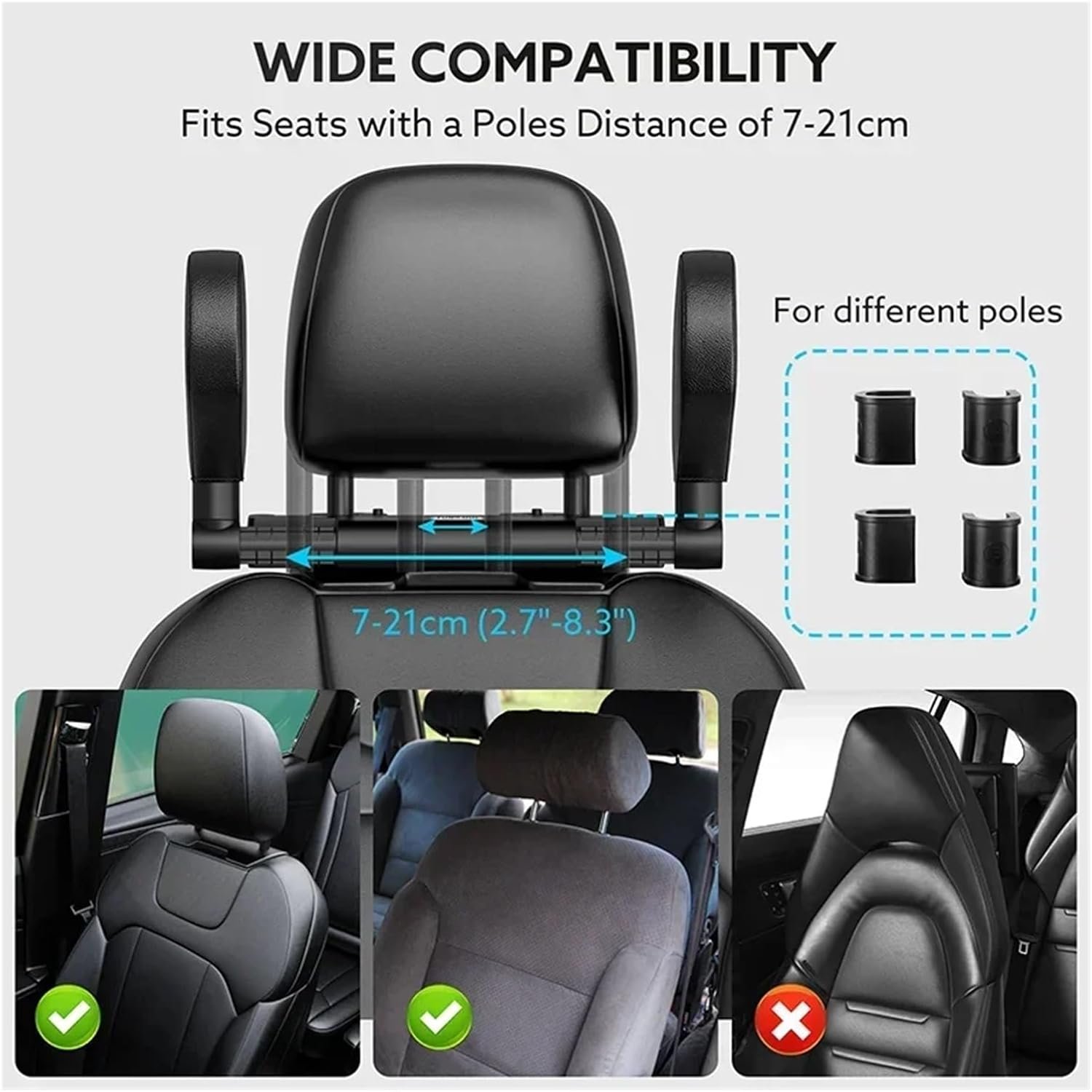 Large compatibilité : ce coussin d’appui-tête est compatible avec la plupart des sièges auto équipés de barres d’appui-tête métalliques et d’une largeur intérieure comprise entre 70 et 210 mm (2,7 et 8,2 pouces). De plus, ce coussin est compatible avec la plupart des rehausseurs, sièges auto pour tout-petits et sièges auto pour enfants. Remarque : avant l’achat, assurez-vous que votre siège auto est équipé de barres métalliques réglables en hauteur.