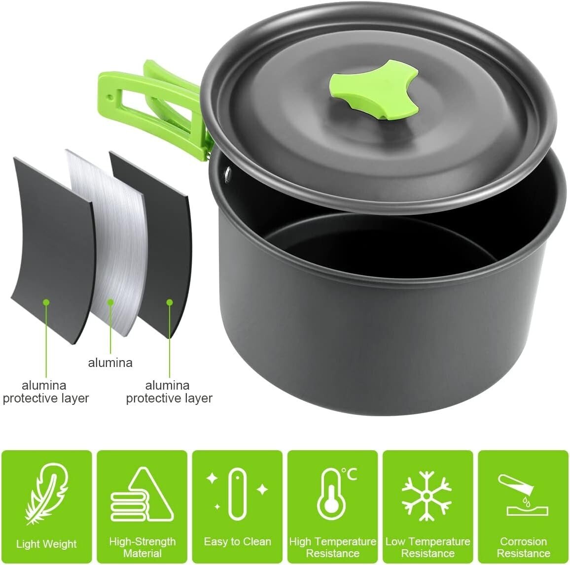 - Parfait set de camping haute résistance et facile à nettoyer, inclut une batterie de cuisine de camping composé d’un procédé anodisé, avec revêtement antiadhésif, résistant aux hautes températures et à la corrosion.
