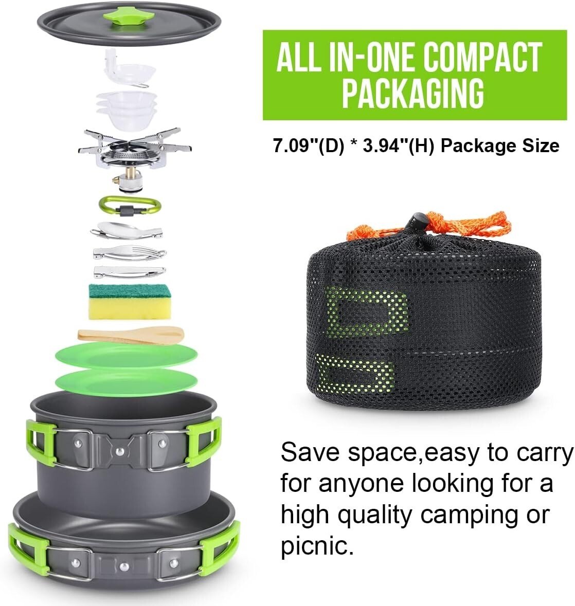 - : les couverts de camping n’ont qu’un diamètre de 7 pouces et une hauteur de 10 cm lorsqu’ils sont emballés. Très facile à transporter une fois empilés et mis dans le sac de transport en filet.