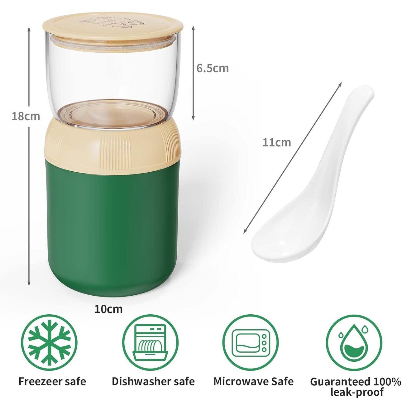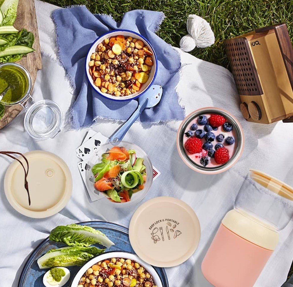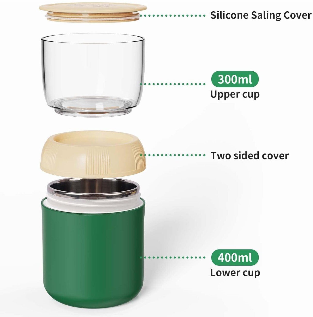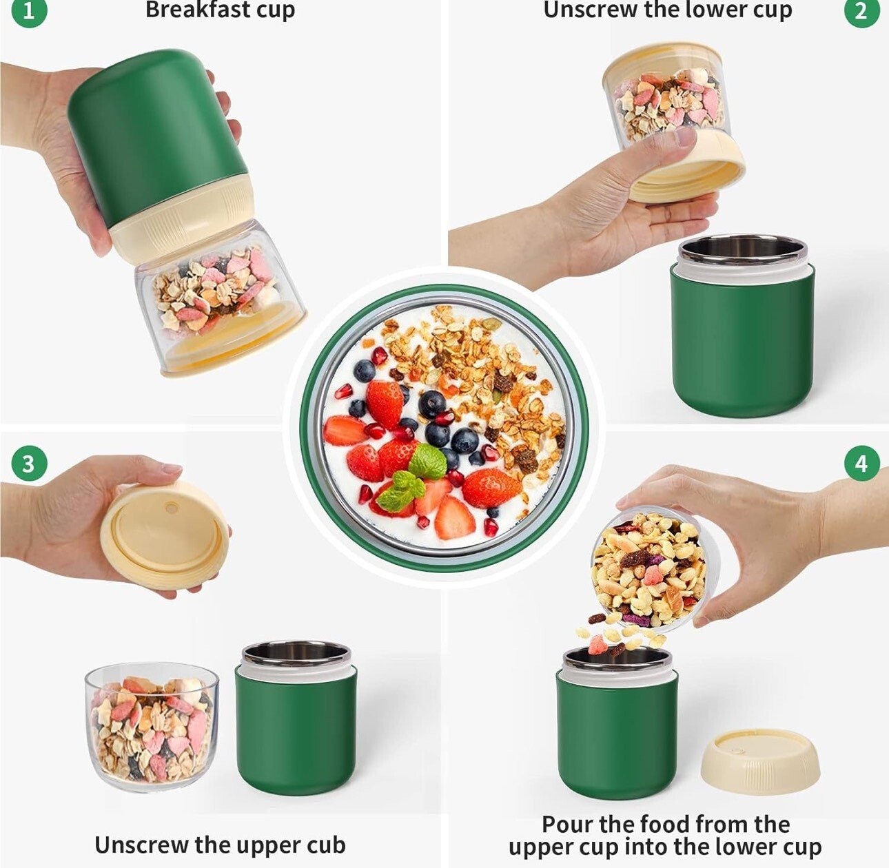 • Multi-fonctionnel – La boîte repas est polyvalente et peut être utilisée comme tasse à yaourt, tasse à soupe, pot à goûter ou tasse à muesli à emporter. Par exemple, la coupe inférieure peut contenir du yaourt, du lait, de la soupe, de la salade, des smoothies ou des aliments pour bébés, tandis que la coupe supérieure est idéale pour les céréales, les noix, les fruits, les en-cas, les sauces, etc.