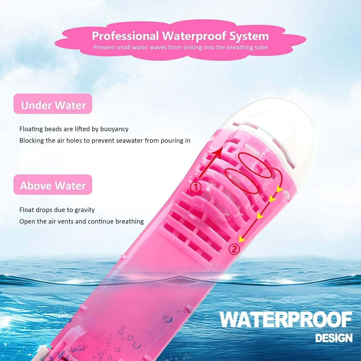 - Système Dry Stop : lorsque les tubes de plongée sont au-dessus de l’eau, les boules flottantes tombent en raison de la gravité et laissent plus d’air pénétrer dans les poumons. Si les tubes de plongée sont sous l’eau, les boules flottantes se lèvent en raison de la flottabilité pour empêcher l’eau de pénétrer dans le masque de plongée des enfants. Le tuba pliable peut être facilement assemblé et assemblé avec un sac de rangement. se plie pour accueillir pour économiser et transporter facilement