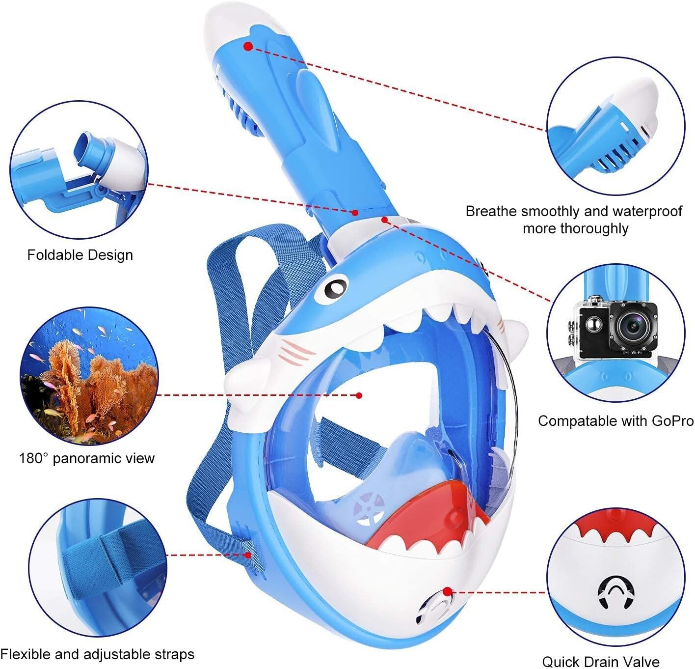 - Panorama à 180° et respiration libre : le masque de plongée shark pour enfants est fabriqué en silicone et en fibre de polyester de qualité alimentaire et offre aux enfants une vue panoramique à 180 ° et de belles visites sous-marines. Respirer librement et confortablement par le nez et la bouche pendant la plongée sans être limité par le tuba traditionnel. Ainsi, vous pouvez profiter d’une bonne circulation de l’air et d’un temps de plongée prolongé.